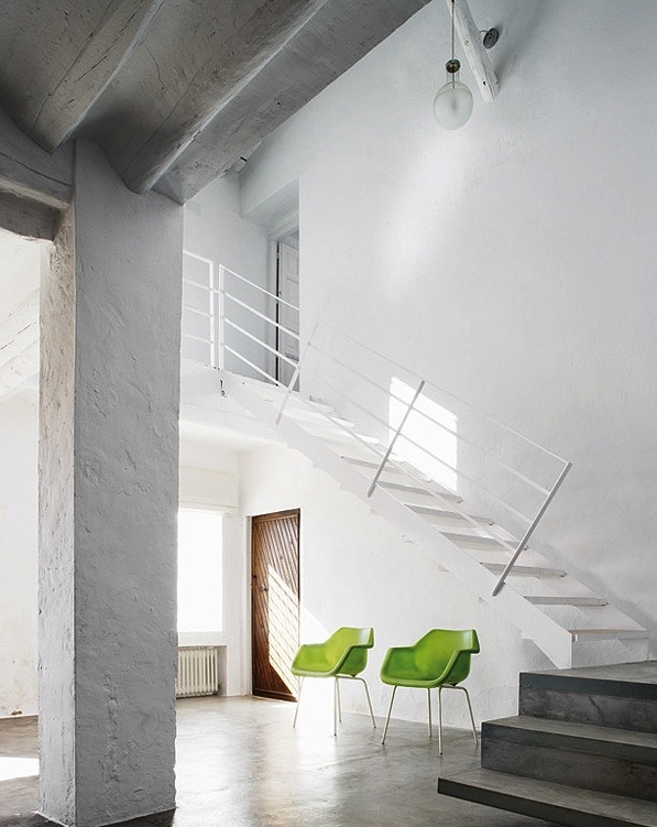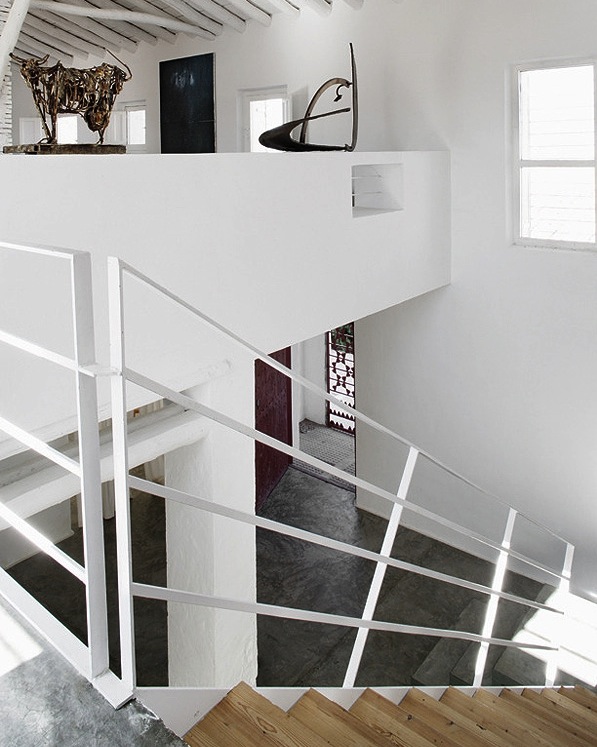 The wonderful, spare structure of the original house in rural Spain has been retained. A concrete floor is poured, a new staircase inserted, a simple tread and handrail detail added; old walls are kept raw, carefully considered niches are added. The house, old and new, is painted white. A sculpture placed here, a pop of colour there.