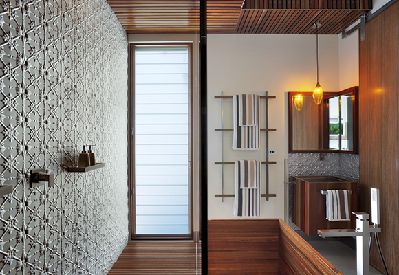 23. Rich-red slatted wood and bold white pattern by AlsoCan architects