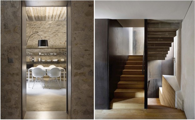 In the ancient Catalan city of Girona is this apartment, in a building dating from the 16th century. The vernacular of exposed timber beams and rough stone walls is cleverly countered with the contemporary materials – black metal, wood veneer cabinetry stained black, rendered walls, solid timber floors. Openings and junctions are lined and restrained with black metal, horizontal surfaces are either recessed or allowed to float freely. Textures abound in the simple, raw palette of materials and neutral furniture.