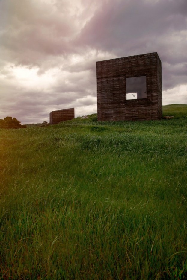 Barely larger than their four sheets of plywood, the cabins are off-grid and autonomous, their outsides burnt black. I love the description of the architects’ vision, a ‘poetic of small boats bobbing in a sea of grass’. There are no doors. One climbs up boulders and in through a window instead. Each comprises a tiny bathroom (both have showers that are outdoors), a kitchen, a sitting area and a sleeping loft. Each has two large windows and wooden hatches that allow ventilation of the bathroom and sleeping areas. A window in the ceiling allows a view of the night sky. The interior of one of the cabins is covered in honey-coloured ply; the other is inky black. A perfect owl’s house.
