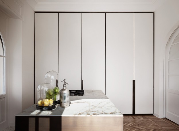 The palette is calm, with pale colours allowing  the light to bounce and play. Then come the details, which transform the apartment into a sophisticated, refined space. In the kitchen, an island bench in bronze contrasts with a grey-veined, white marble top; the materials mitred at the edges as if they were cast as one piece.