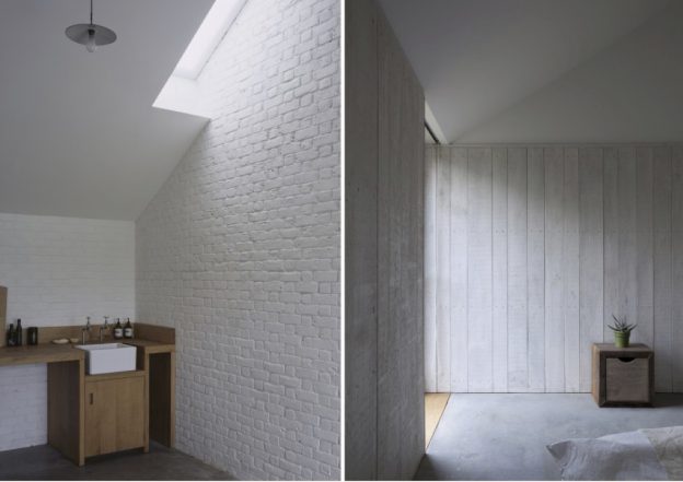 The materials used are simple and locally sourced, including concrete floor, beton brut walls, white painted brickwork, and externally, profiled metal roof and timber cladding. The detailing is refined and carefully crafted. With the materials expressed in their pure form or painted white, texture provides all the decoration that is needed.