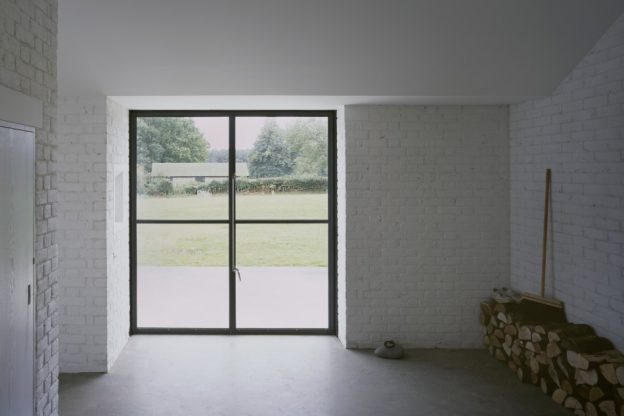 The spaces are laid out along the length, each opening onto the tranquil landscape beyond. The long narrow footprint is divided simply into two – living and sleeping – the one open and light filled, the other enclosed and calm. In the living spaces, black floor to ceiling Crittal windows frame the view and maximise the light, opening up completely to create a flowing indoor/outdoor space. A fireplace wall book-ends one side, taking on the vaulted form of the structure.