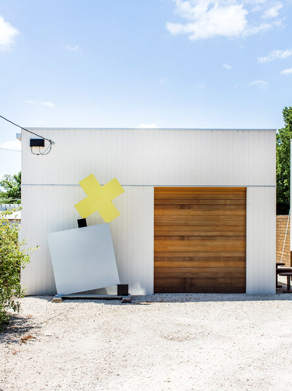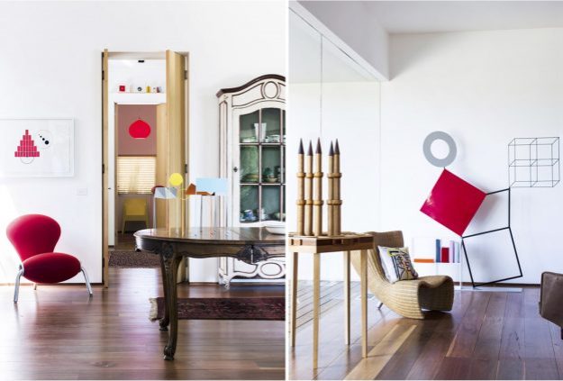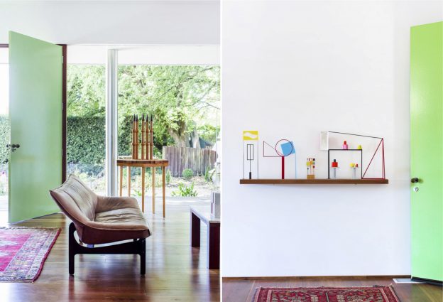The palette of materials is thus restrained, starting with floors of richly polished timber and walls of glass, creating an almost invisible boundary with the outdoors. Extraneous elements have been removed –  doors are recessed into wall thicknesses or simply framed in wood; junctions abut each other crisply. Elements of singular colour counterbalance the bold hues of Peter’s sculptures. Door handles and drawer pulls were designed and made by the artist, along with many of the light fittings. Furniture is a mix of antique and modern. Marc Newson’s idiosyncratic pieces are stand-outs, from the fabulous Wicker and Embryo chairs to the Super Guppy floor lamp, all of which sit comfortably amongst Peter’s bold, architectural forms.