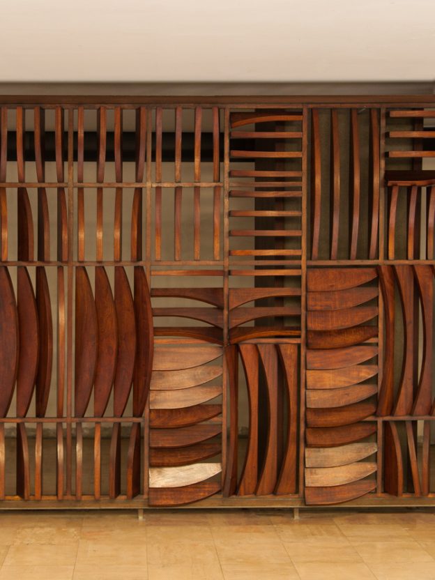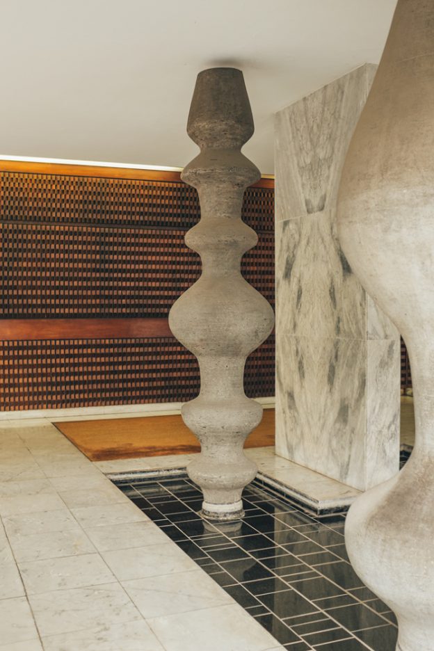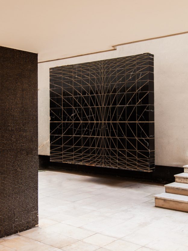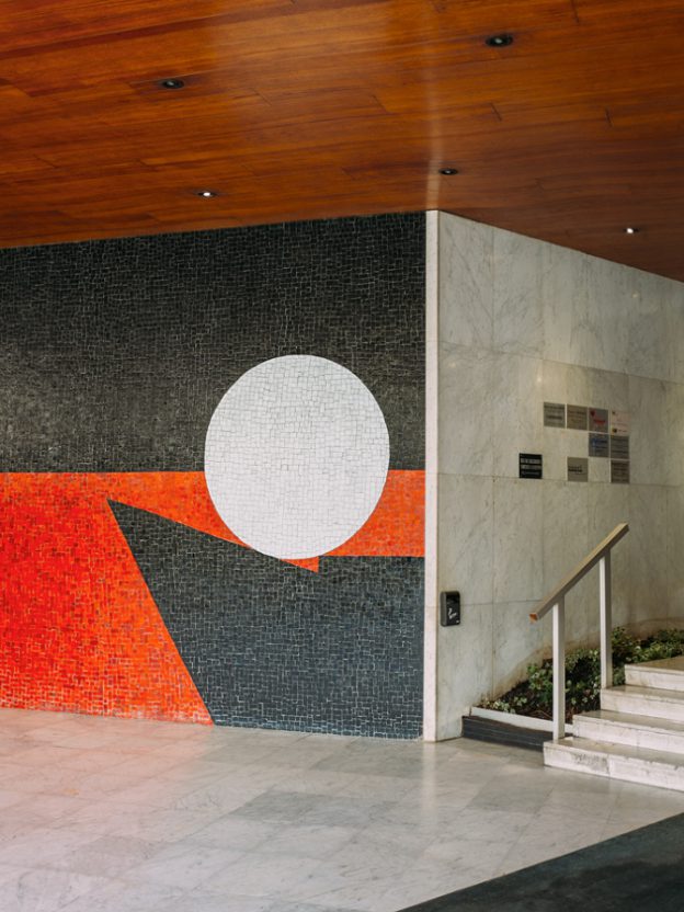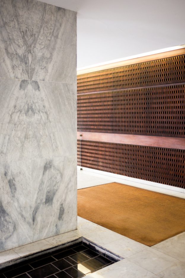 Romain started working as a graphic designer, working at French Vogue for 4 years. Now 28, his obsession is photography. The places he has found and photographed – the ones I like the most – are the foyers of modernist buildings from the ‘60s and ‘70s, most often in Paris. These wonderful interiors are rich in colour and texture – black granite cladding inlaid with bronze, or rows of mosaic tiles in bold hues of orange or red; bold concrete forms standing like voluptuous, oversized chess pieces, and floors of verde green marble. All surfaces have been considered – fine, dark bricks laid obliquely adjoin a ceiling of glossy black and red tiles; a vertical screen of rich brown wood opposes perfectly proportioned piers of tiny, matt black mosaic.