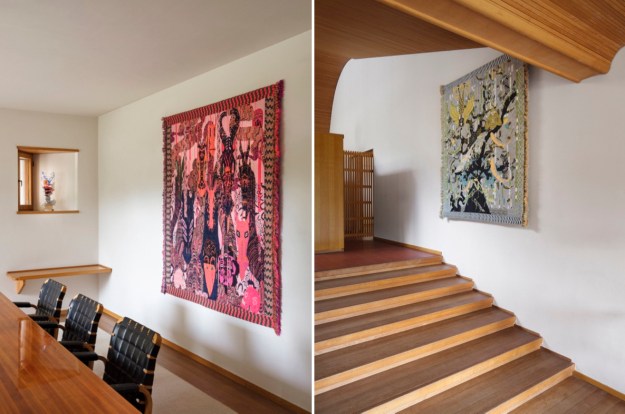 There is something rather wonderful about seeing art and sculpture in a relatable, residential setting rather than the rarefied environment of a white-walled gallery. Aalto’s interiors are typically congenial and light-filled and as was his way, everything down to the light fittings, fixtures and loose furniture were Aalto designed. The house itself emerges from the French countryside, its swooping roof of blue Normandy slate imitating the surrounding landscape, evocative also of the simple form of a Finnish laavu. Walls and base of nearby Chartres limestone create a patchwork with white rendered brick and panels of timber. The pine wood continues within, adding warmth and interest against the expanses of white walls. The roof, a simple but dramatic line when viewed externally, becomes a glorious feature of the large entrance hall on the inside – timber lined, it utilises Aalto’s often used organic curves – as seen in his signature Savoy vase, with its iconic quintet of curves. Column free and with vast expanses of wall for hanging art, this space is the predominant gallery space. The adjoining living room fronts on to the expansive view, with its panorama window, and provides a more intimate domestic setting for the art.
