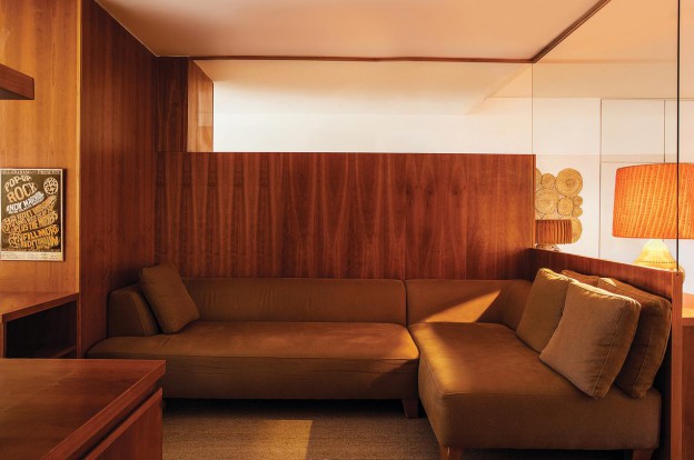 Walls throughout are lined with blond elm in a beautiful pale honey colour, floors are clad in neutral coverings. Materials are used simply and boldly – note the grey-veined marble in the bathroom used for the countertop, upstand, cabinetry and floor. I love this look.  A den is arranged in the centre of the space with wood-lined walls and warm-coloured, custom furniture; the master bedroom is lined too and can be closed off from the world with wooden shutters lining the windows. In the laundry, timber-lined cabinets add a richness to what is too often a sterile room of white cabinets. Artwork adds further warmth and personality.