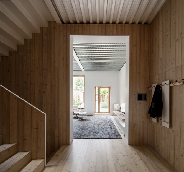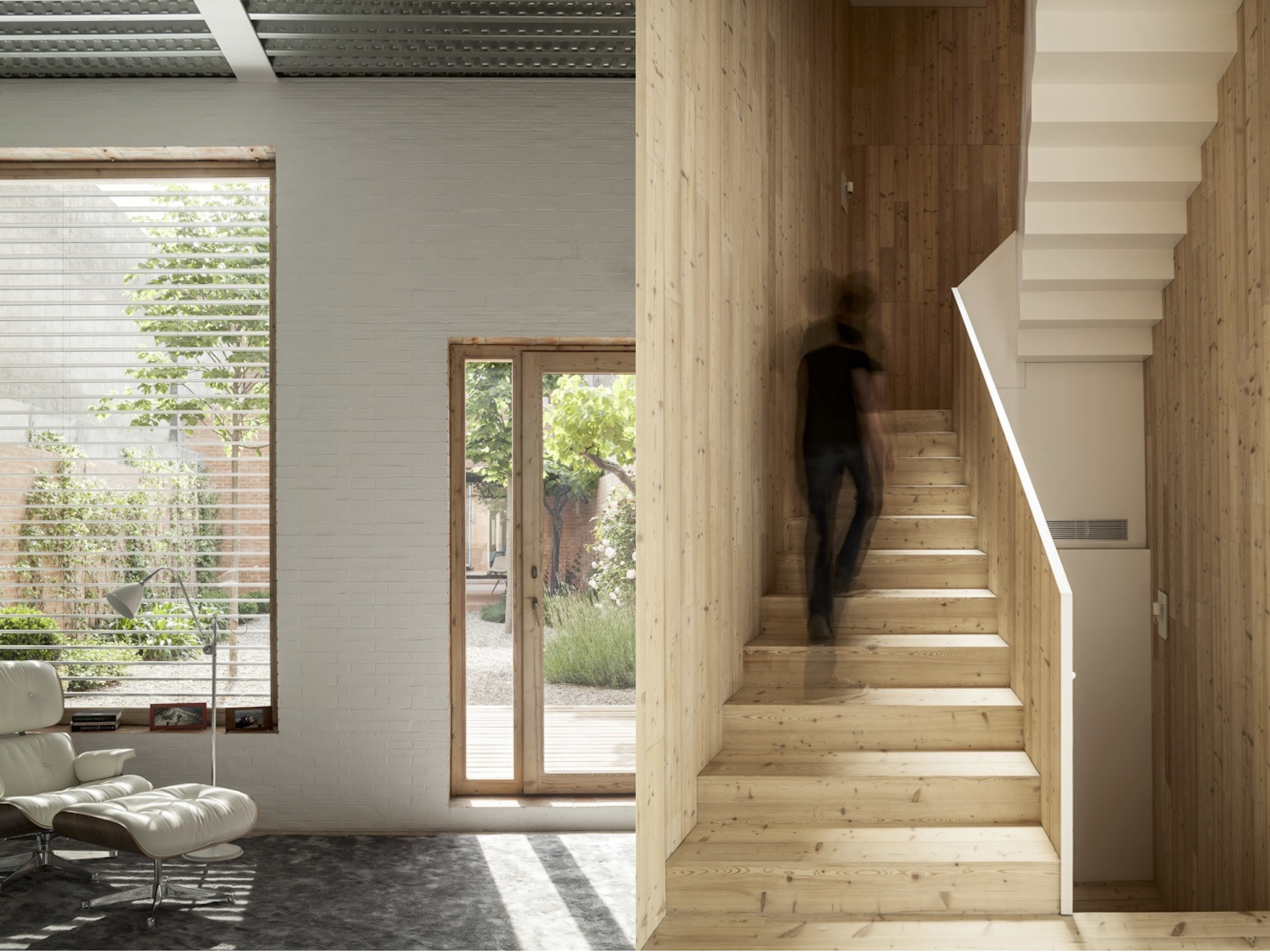 Because the colour and rhythm of the exterior masonry is visible from within, the interior walls are painted white, with just the window reveals left raw. There are simple, pale wood floorboards and an exposed (but beautifully detailed) metal ceiling. Sometimes, the materials are reversed, and the ceiling or walls are lined with wood. The zig zag line of the stair soffit plays against the pattern of the metal ribbed ceiling as it rises up, as well as the rhythm of the wood planks.