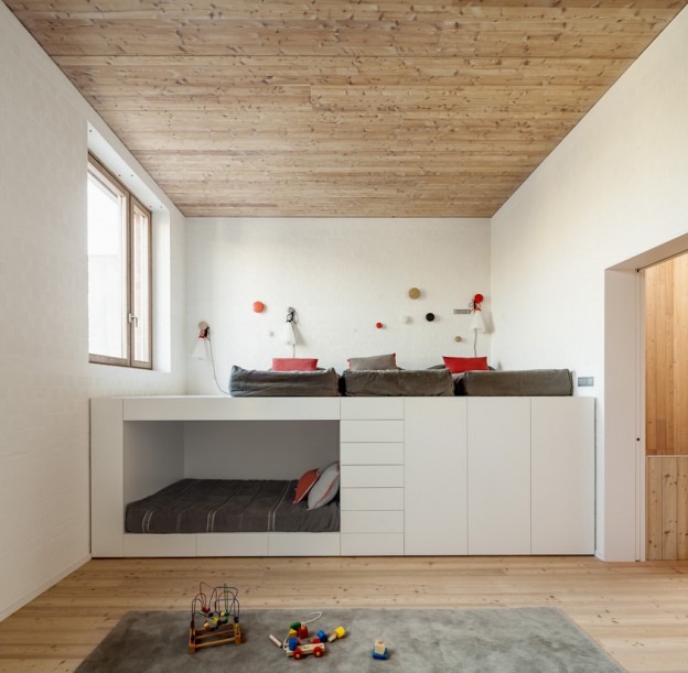 A kid’s room contains a single piece of furniture serving all necessary functions – sleeping, reading and storage.