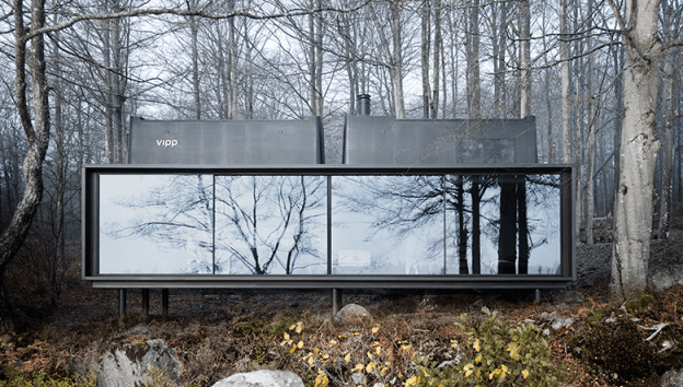 Vipp Shelter is a 55m2 cabin comprising living, bathing and eating areas, and sleeping for 4. They are prefabricated in Denmark and brought to site – anywhere in the world you happen to own a piece of wilderness – where they are erected in a few days. The facade is sheet metal, fully insulated and painted black. And everything is included. There is a complete kitchen, in matt black, with Vipp fittings and all cutlery, kitchen utensils and plates. A fully functioning bathroom, with towels. The sleeping loft has an integrated bed with bedding. All lighting is included. A functioning fireplace, floor heating.