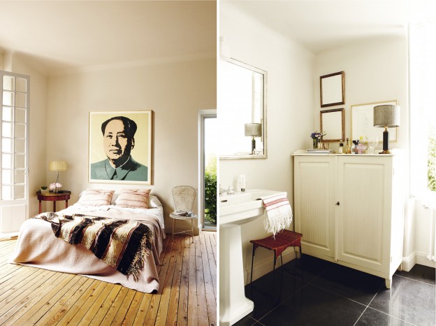 Vernacular elements – white washed walls, shuttered windows and beamed ceilings – set the scene. Then inside, a charming mix of provincial, art deco and midcentury pieces and objet have been brought together. With the exception of the sofa and Bouroullec armchair and ottoman, everything has been sourced second hand. From the brocantes of Paris, to local flea markets and antique shops, an array of wonderful pieces cohabit – pieces by Charlotte Perriand, Pierre Guariche (chairs and lighting), and Eero Saarinen Tulip chairs and tables.