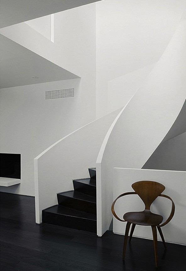 Interior finishes are kept simple – painted white or fabricated in super-hard white Corian, a man-made, solid-surface material composed of marble dust, bauxite, polyester resins and pigments. All floor surfaces, including the stairs are wood, stained almost black.