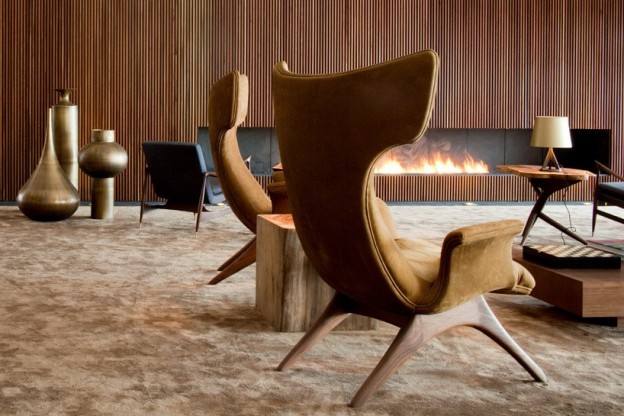 In a series of low-slung, white, modernist buildings set among vineyards is this hotel. The warm, earth-toned interiors are dominated by wood and slate, with timber slat walls dividing the linear spaces according to function. Copper light fittings and bronze sculptural pieces add glamour to the wonderfully textural, bespoke furniture pieces.